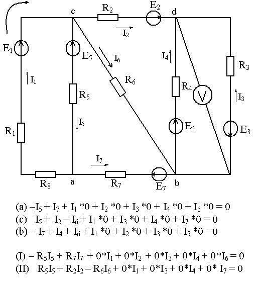 Да, вот еще записал выражение для баланса мощностей, не знаю правильно, или нет (R1 + R8)*I1 + R5*I5 + R2*I2 + R6*I6 + R7*I7 + R4*I4 + R3*I3 = E1*I1 + E2*I2 + E3*I3 + E4*I4 + E5*I5 + E7*I7 PS Каждый ток I возведен в квадрат. Я это не написал, но учел. -------------------- Нас десять братьев на тропе, идем мы быстро, на легке ...