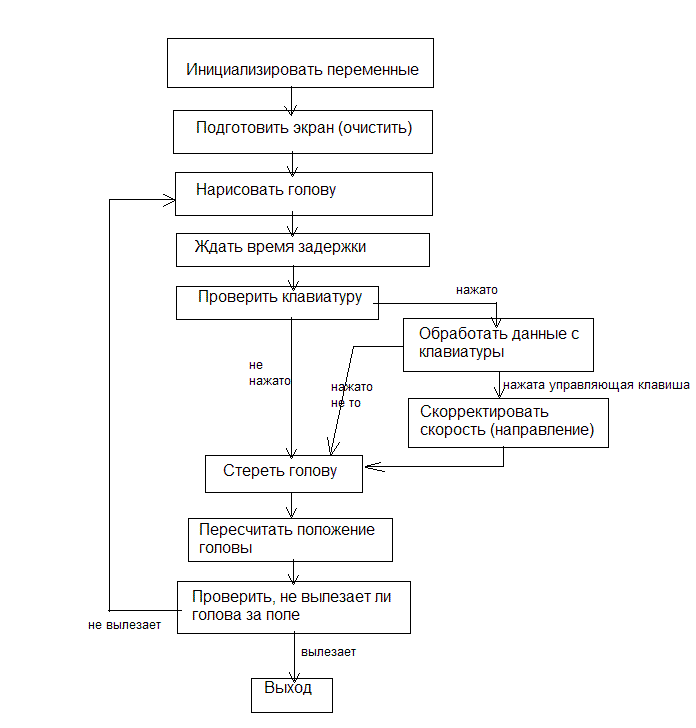 Итак, что же изменилось в Змейке-2 по сравнению со Змейкой-1? А вот, что: я убрал одну пару переменных, x0 и y0 - они оказались лишними. Перестановки операторов связны с этим. (То есть в целом ты была права, но нужно конкретнее, выделить главное, отсечь второстепенное - добавлено позже) Теперь о блок-схеме. Вот она: Пожалуйста, просмотри ее и найди соответствие между блоками и операторами в программе. А теперь время сделать что-то новое - шаг вперед! В качестве такого шага я предлагаю убрать одну строку из программы. В самом конце есть такая строчка, она состоит из двух операторов: GoToXY(x,y);Write(' '); Стирать ее не обязательно, можно просто закомментировать, то есть заключить в фигурные скобочки {}. После этого компилятор не будет обращать на нее внимания. То, что получится, будет в каком-то смысле больше похоже на змейку, чем бедная одинокая голова (восьмерка). Но вот беда - все тело нашей змеи пока состоит из одних голов! Как это исправить?.. Подумай, а потом прочти ответ на строчке ниже (выдели блоком) и сделай так. Вернуть строчку назад, но пробел в операторе Write заменить на ноль (0). Сообщение отредактировано: lapp - -------------------- я - ветер, я северный холодный ветер
