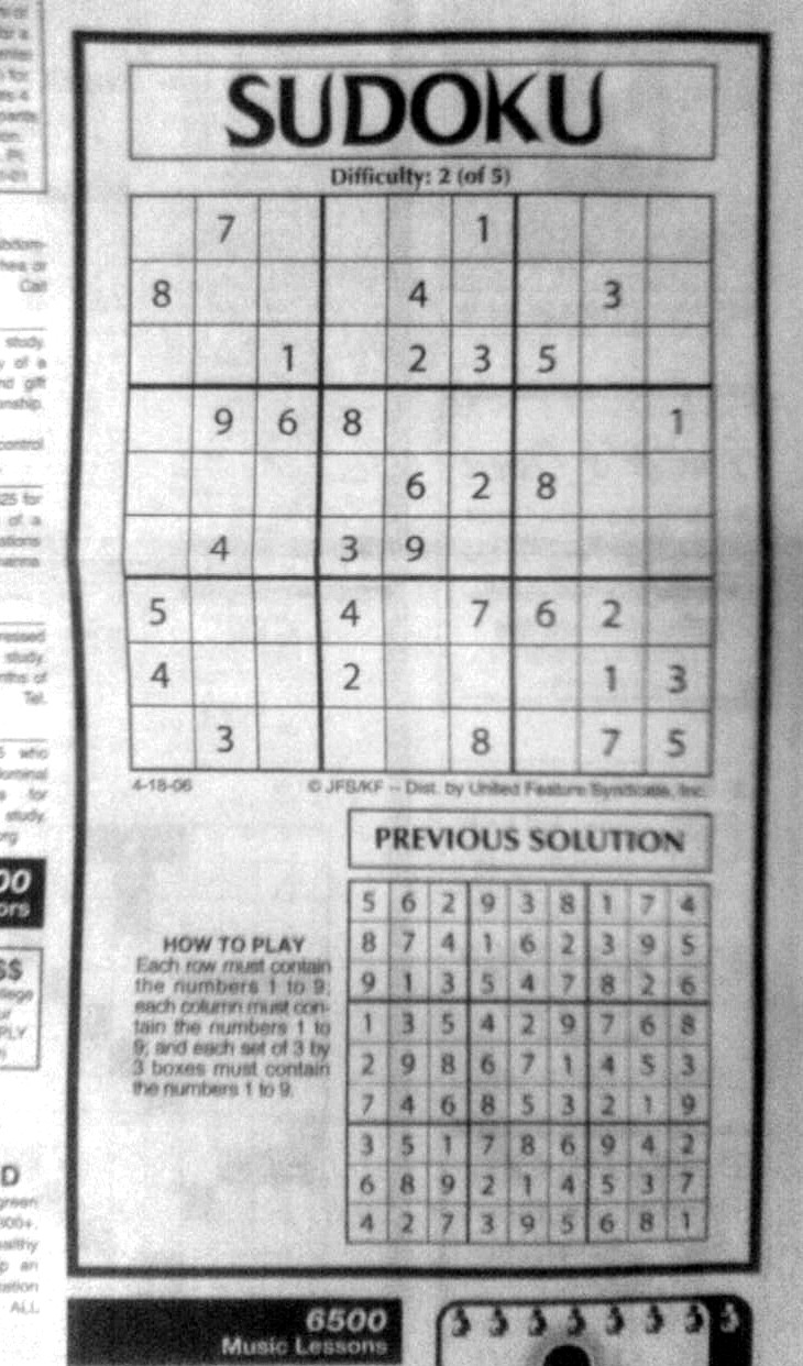 Она появилась не очень давно, несколько лет назад. Я не знаю, насколько она сейчас распространена в России, поэтому рассказываю подробно (извините, если это излишне). По смыслу и по виду напоминает кроссворд, но в отличие от него она не буквенная, а цифровая. Хотя, цифры там используются только как значки - никаких операций над ними (сложения и т.п.) не проводится. Говорят (и я охотно этому верю), что она прежде всего завоевала популярность в Японии, потому что бедные японцы, ввиду особенностей своей письменности, лишены возможности разгадывать кроссворды - хотя появилась она на Западе. Если сейчас зайти в любой книжный, то прямо у дверей увишь специальный стенд, на котором стоит десятка два-три как тонких так и очень толстых книг с этими головоломками..