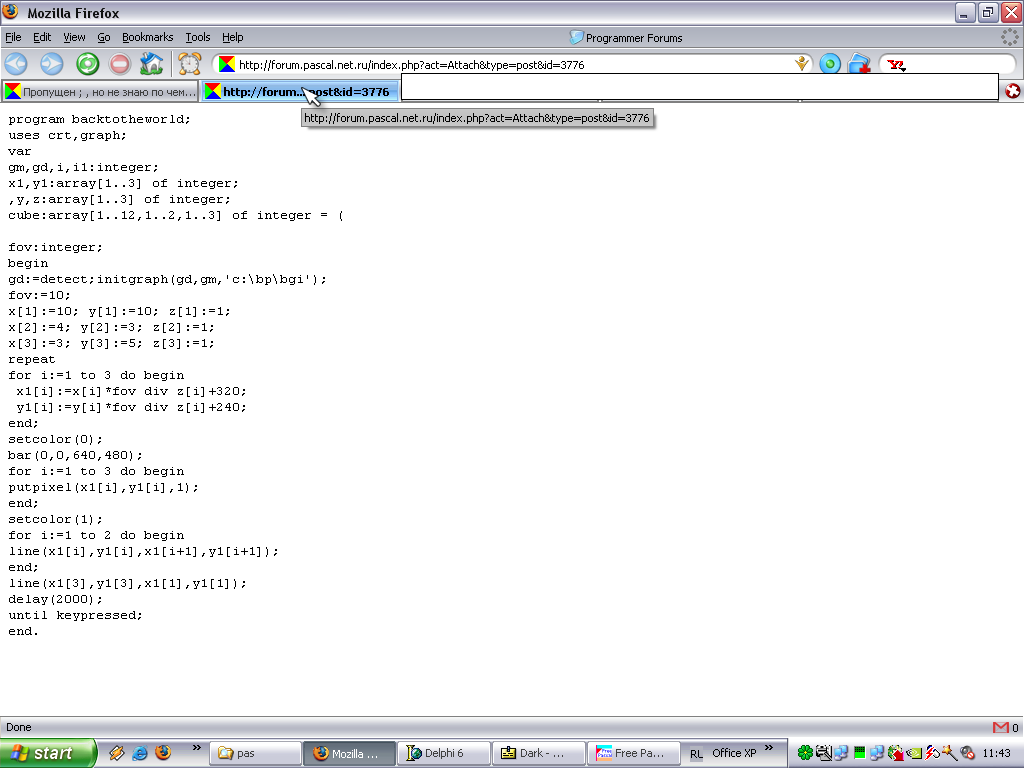 cube:array[1..12,1..2,1..3] of integer = ( ((-10,-10,-10),(10,-10,-10)), ((-10,-10,-10),(-10,10,-10)), ((-10,10,-10),(10,10,-10)), ((10,-10,-10),(10,10,-10)), ((-10,-10,10),(10,-10,10)), ((-10,-10,10),(-10,10,10)), ((-10,10,10),(10,10,10)), ((10,-10,10),(10,10,10)), ((-10,-10,10),(-10,-10,-10)), ((-10,10,10),(-10,10,-10)), ((10,10,10),(10,10,-10)), ((10,-10,10),(10,-10,-10)) ); пишет после integer пропущен ; , но почему? всё же правильно! Вопрос 2: Я правильно сделал предидущий массив? (-10,-10,-10) это получается x,y,z у меня. Размеры array я правильно задал? Вроде бы нет =( Кстатей если я хочу вызвать второе число массива это делается так? cube[1,1,2] ? |