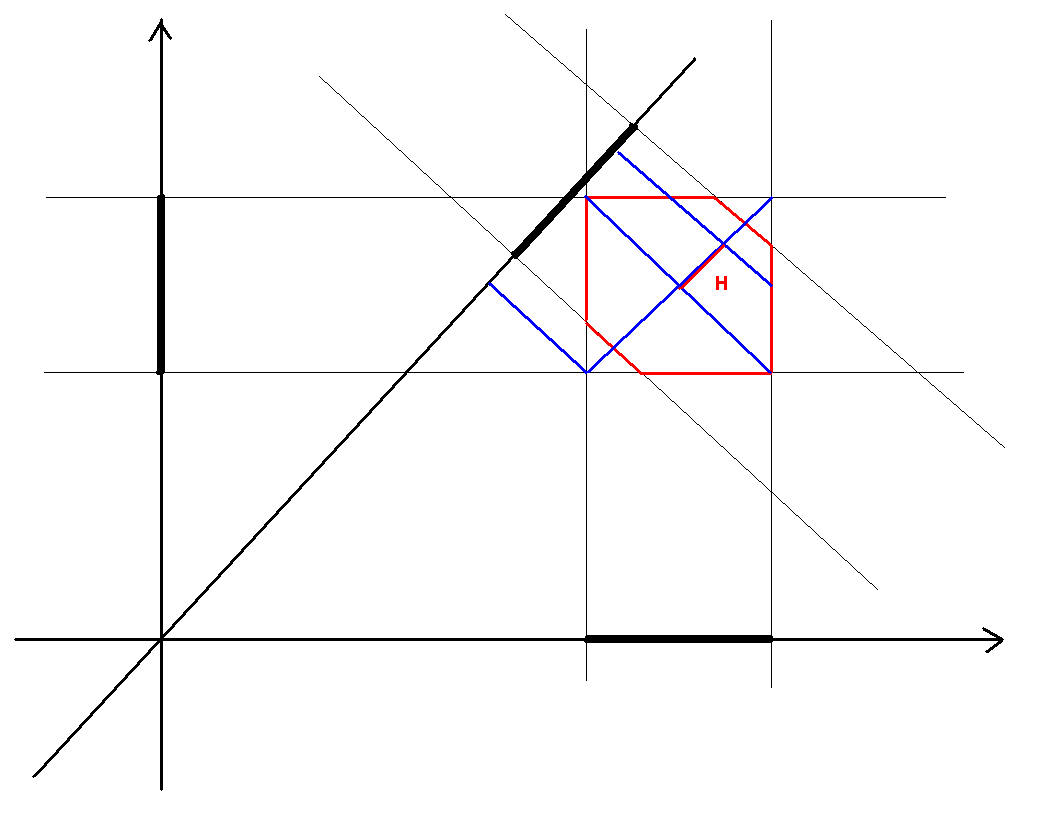 Задача совсем простая. Две полосы широной 1, перпендикулярные осям, дают в пересечении квадрат со стороной 1. Третья единичная полоса, перпендикулярная прямой х=у, должна быть сцентрирована на центр этого квадрата.