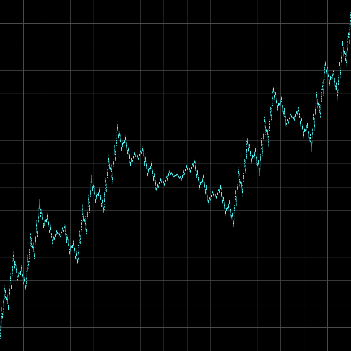Вроде фрактала Действительно похоже на фрактал.. А слабо оценить ее длину? конечная она или нет? Моя гипотеза - конечная. Я вспомнил (как всегда, поздно), что уже слышал про существование такой функции, но уточнить ее вид тогда как-то не удосужился, а потом и вовсе забыл. Так что сейчас стал доказывать противоположное Но задача явно красивая и заслуживает особого внимания. И я решил построить ее график.. Смотрите, что получилось: Красиво? Разумеется, я вывожу только точки - соединять их линиями для такой функции было бы в корне неверно. Поэтому она выглядит разрывной. Если увеличить количество точек, можно добиться сплошного вида на графике, но будет менее красиво (пробовал, могу положить сюда по запросу). Если кто хочет поиграться сам, привожу паскалевскую функцию, которая вычисляет эту самую функцию. Кстати, я для себя называю ее Молнией. Не правда ли, похожа? function Lightning(x,s:real):real; Здесь х - параметр, а s - точность. Я брал точность 0.000001. Так как насчет вычисления длины, а? -------------------- я - ветер, я северный холодный ветер
