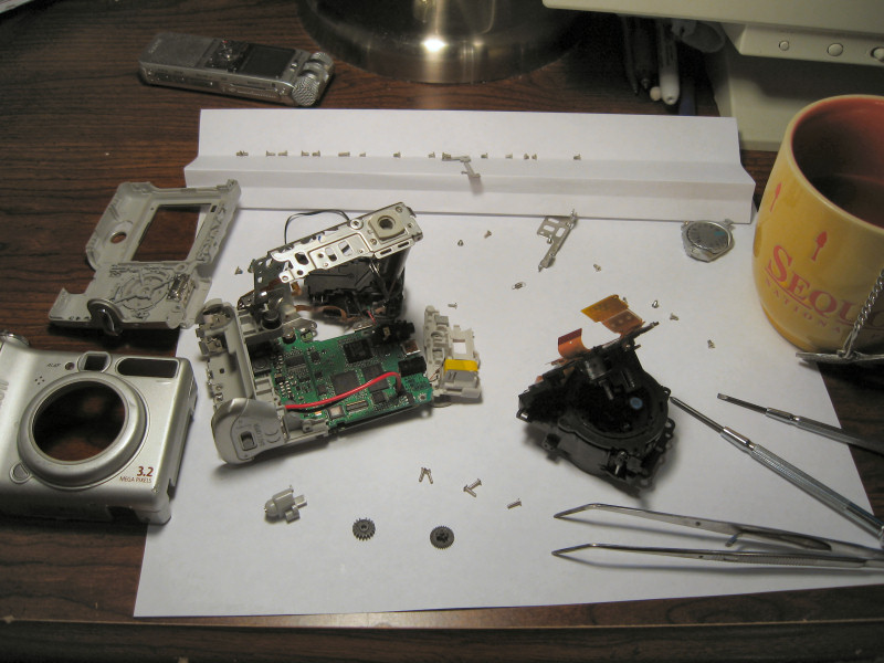 Сижу, разбираю цифровую камеру, Canon A510. Она была уронена на пол, выдинутым объективом вниз (не мной!). Помощи не прошу - думаю, невозможно в таком деле помочь заочно.