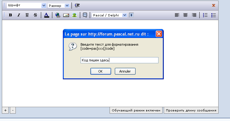 Выбираем в listbox интересующий нас язык Пишем что-то в появившимся окне, весь код сюда запихнуть далеко не всегда получается Получаем то, что написали, заключенное в тегах Если надо еще что-то написать - не беда Сообщение отредактировано: Bokul - -------------------- Лао-Цзы :