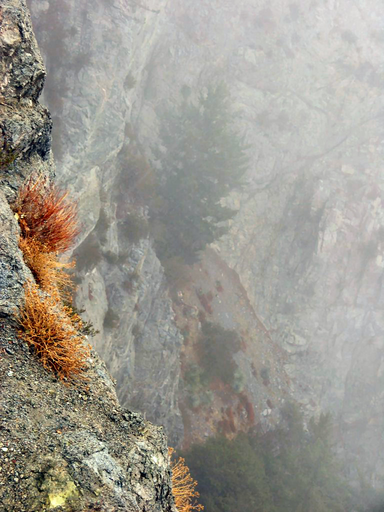 А пока - только один снимок: взгляд вниз с обрыва на отвесную же стенку. Все при этом в тумане (в облаке).