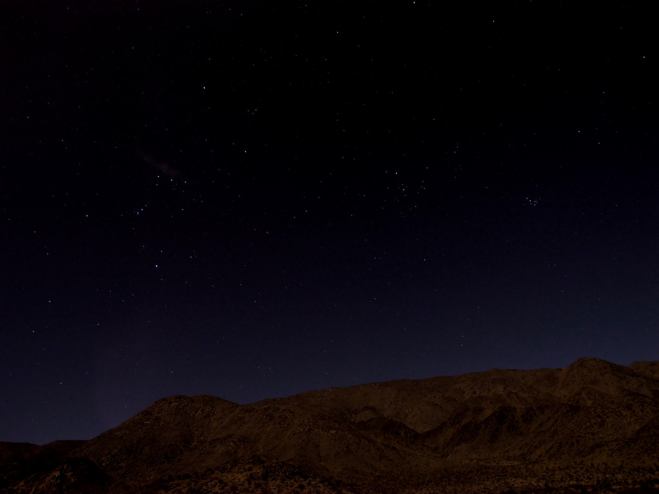 Снято примерно в девять вечера 4 марта. Как я узнал позже, буквально за несколько часов перед этим было лунное затмение. Соответственно, сейчас Луна полная. Направление снимка - примерно на Запад. Небольшая подсветка над горой - видимо, еще от солнца. Очень хорошо виден Орион, Телец и Плеяды. Это уменьшенная копия, а на оригинале звезд больше, чем я видел невооруженным глазом.