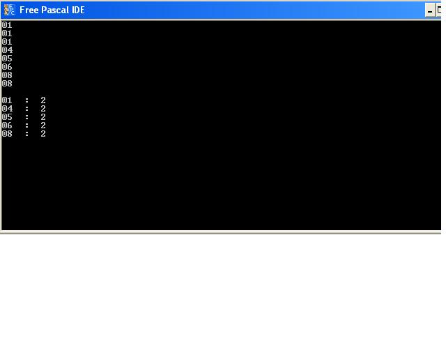 ║ ║ reset(osnov); ║ t:=filesize(osnov); ║ getmem(z,t*sizeof(Zap)); ║ getmem(x,t*sizeof(HZ)); ║ k:=0; ║ while not(eof(osnov)) do ║ begin ║ read(osnov,Zap); ║ inc(k); ║ z^[k]:=zap; ║ end; ║ close(osnov); ║ k:=0; ║ reset(osnov); ║ while not(eof(osnov)) do ║ begin ║ read(osnov,Zap); ║ inc(k); ║ x^[k]:=helpzap; ║ end; ║ close(osnov); ║ k:=0; ║ i:=1; ║ while i <= t do ║ begin ║ p:=1; ║ inc(i); ║ while z^[i].CodeOTD = z^[i-1].CodeOTD do ║ begin ║ inc(p); ║ inc(i); ║ end; ║ inc(k); ║ x^[k].CODEOTDELA:= z^[i-1].CodeOTD; ║ str(p,x^[k].TAB); ║ end; ║ ║ For i:=1 to t do ║ writeln(z^[i].CodeOTD); ║ writeln; ║ For i:=1 to k do ║ writeln(x^[i].CODEOTDELA,' : ',x^[k].TAB); ║