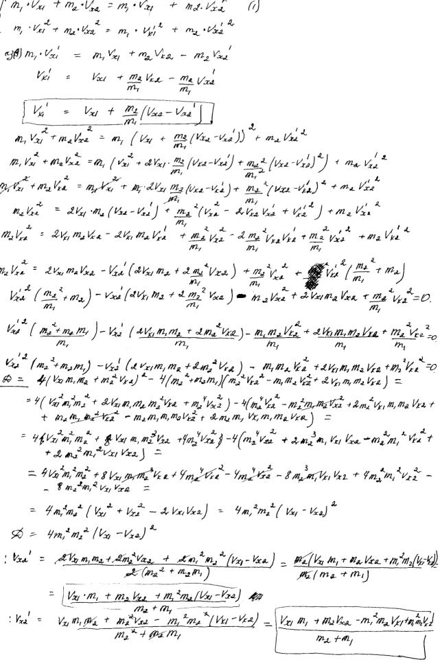 Ошибок в математике не нашла.... (но у меня получилось 2 набора значений для Vx1' и Vx2' (а также Vy1' и Vy2'), подставляла каждое - результат тот же)