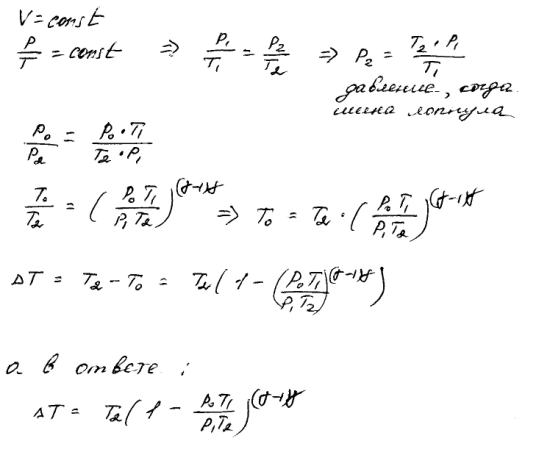 Автомобильная шина накачана до давления р1=220 кПа при Т1=290К. Во время движения она нагрелась до температуры Т2=330К и лопнула. Считая процесс, происходящий после повреждения шины, адиабатным, определить изменение температуры Т вышедшего воздуха. Внешнее дпаление р0 воздуха равно 100кПа.