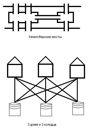 2) Задача о трех домах и трех колодцах. Имеется три дома и три колодца. Провести от каждого дома к каждому колодцу тропинку так, чтобы тропинки не пересекались.