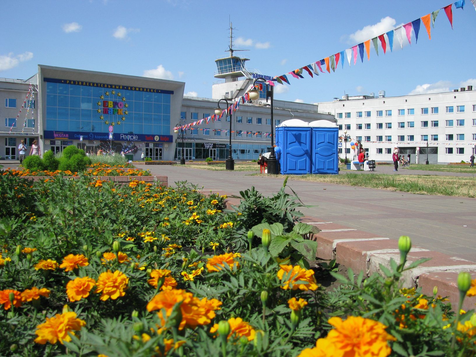 1. Никакой. Сгодится только для исторической справки через какое-то время. Я понимаю, что ты снимал: желтые цветы, разноцветные флажки, воздушные шарики (эти - очень мелко, глазами выглядело гораздо крупнее). Блестящее стекло, чистые стены, антенны.. Все это могло сыграть, но не играет. Кадр ни о чем. Нет главного (если, конечно, не считать главным туалеты точно в центре кадра..)).