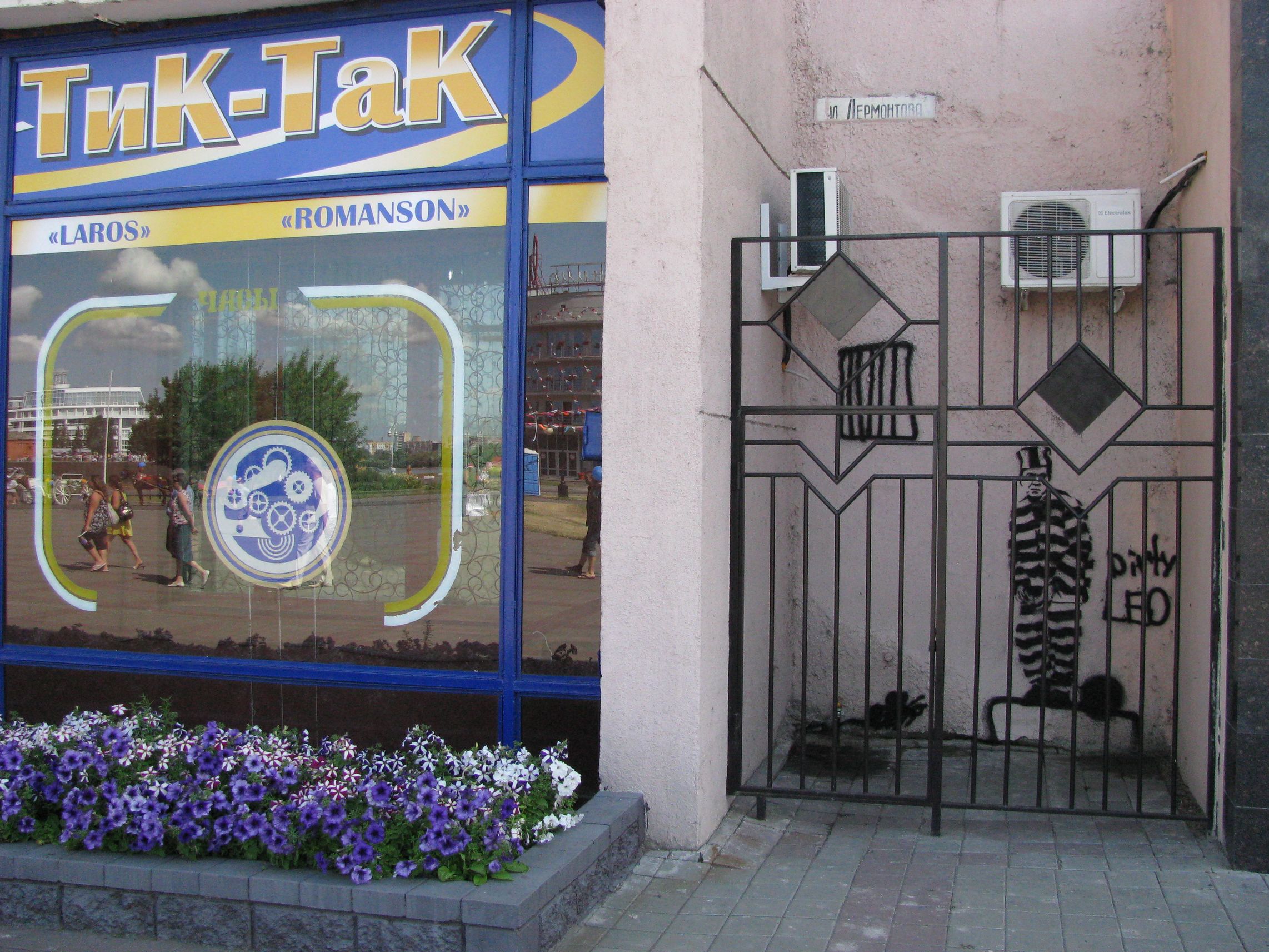 3. Забавно. Три главных момента: решетка с графикой, витрина, отражение. Взаимодействие между ними слабое, никакой сам по себе не превалирует. Перспектива мешает восприятию (нередко бывает, кстати), линии срезаны. Снято на автомате, диафрагма полностью открыта (нельзя в таком кадре за ней не следить!!). Ты снимал графику, признайся (без нее тут просто ничего нет) - ну так и снимал бы ее! потрать полчаса, сделай несколько кадров, посмотри на них, дождись нужного освещения (солнце могло помочь, хотя не утверждаю) - может, добавь что-то в кадр (человека, стул, пулемет..). Графика сама по себе не самая плохая. Снимок - никакой.