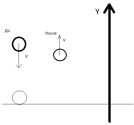 Из рисунка видно, что проекция V на ось Y До = -10 М/с После: = 10М/с => изменение импульса= m(Vдо-Vпосле)=-2mV=2Н*с