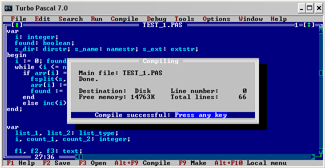 Цитата Если модуль Dos должен быть где то папке с компилятором то у меня его нет Sorry, но если бы его у тебя не было, ты бы получал ошибку еще на первой строке: Цитата Error 15: File not found (DOS.TPU) так что модуль у тебя есть... И находится он в файле TURBO.TPL (по крайней мере, он должен там находиться). Попробуй заменить свой Turbo.TPL моим:Прикрепленные файлы