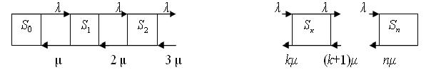 требование, поступившее в момент занятости всех каналов, становится в очередь и ожидает, когда освободится один из них. Пример – магазин, касса.
