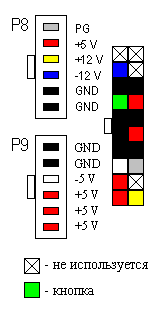 С напряжениями разобраться легко, разъем я просто состригаю со старого сгоревшего АТ и перепаиваю на новый. Так что вопрос состоит в том, как его включать. Если вы помните, стандарт АТ использовал обычный выключатель, а АТХ - кнопку. На том БП, который я хочу переделать, есть задний выключатель, так что мне только нужно узнать, какую пару нужно замкнуть, чтобы БП включался сразу по включении заднего выключателя.