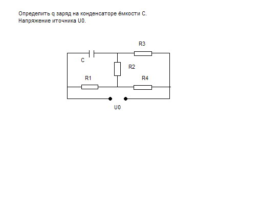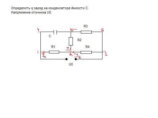 Для решения этой задачи, как записать уравнения по Кирхгофу ? (именно не понятно как конденсатор записать) Или задача решается другим способом ? По идее конденсатор, накапливая заряд, создает разность потенциалов между пластинами, поэтому на нем есть напряжение. Обозначь его U с индексом с (Uc). Тогда q=(Uc)*c. *** Но есть важное замечание. В процессе зарядки конденсатор пропускает через себя ток. После того как конденсатор зарядится ток через него течь не будет, но напряжение на нем будет. Это надо учитывать для правил Кирхгофа. Контур 1254 JoR1+J1R2-Uc=0 Контур 123 JoR1+J2R4=Uo Контур 1256 JoR1+J1(R2+R3)=Uo Контур 2563 J1(R2+R3)-J2R4=0 Jo=Uo/Rэкв Rэкв=R1+(R2+R3)*R4/(R2+R3+R4) Jo=J1+J2 Вроде все, решая эту систему находишь Uc. (некоторые ур-ия могут и не понадобиться) Сообщение отредактировано: Clerick - Эскизы прикрепленных изображений -------------------- После дождя обязательно выглянет солнце)
