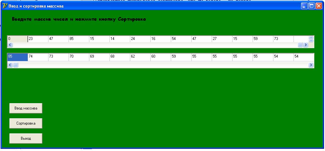 По условию задачи надо отсортировать одномерный массив, заданный случайным образом (n=100), а затем исходную и полученную матрицу вывести на форму (процесс сортировки выводится на экран пошагово).