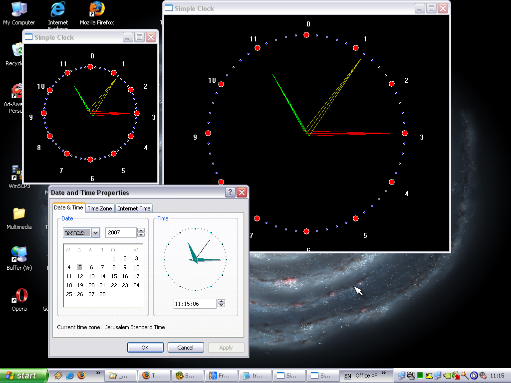 Кол-во скачиваний: 1167Можно запускать несколько копий приложения, при изменении размера окна часы также меняют размер... Надо только добавить несколько функций: 1) запрет дальнейшего уменьшения по достижении какого-то размера, чтобы часы не были слишком маленькими; 2) вывод цифр можно поправить, чтобы во-первых, не выводилось 0 .. 11, а выводилось 1 .. 12, да и сами координаты выводимого текста (а, возможно, и шрифт) мне кажется, надо доработать... 3) ну, в принципе, добавлять можно еще много, только тогда это уже будут не совсем простые часы Если есть желание, давайте доработаем проект... Выбирайте, или это будет работа с API (но без ООП), или через Graph (но ООП), и так и так можно сделать довольно интересное приложение... P.S. Не стал исправлять программу, но заметил, что в ней не освобождается контекст устройства после обработки WM_TIMER... Естественно, поскольку это событие происходит ежесекундно, а контекст создается, и не освобождается - программа начинает "поедать" память. Перед выходом из блока If draw Then ... в обработчике WM_TIMER добавить ReleaseDC(Window, DC); Эскизы прикрепленных изображений |