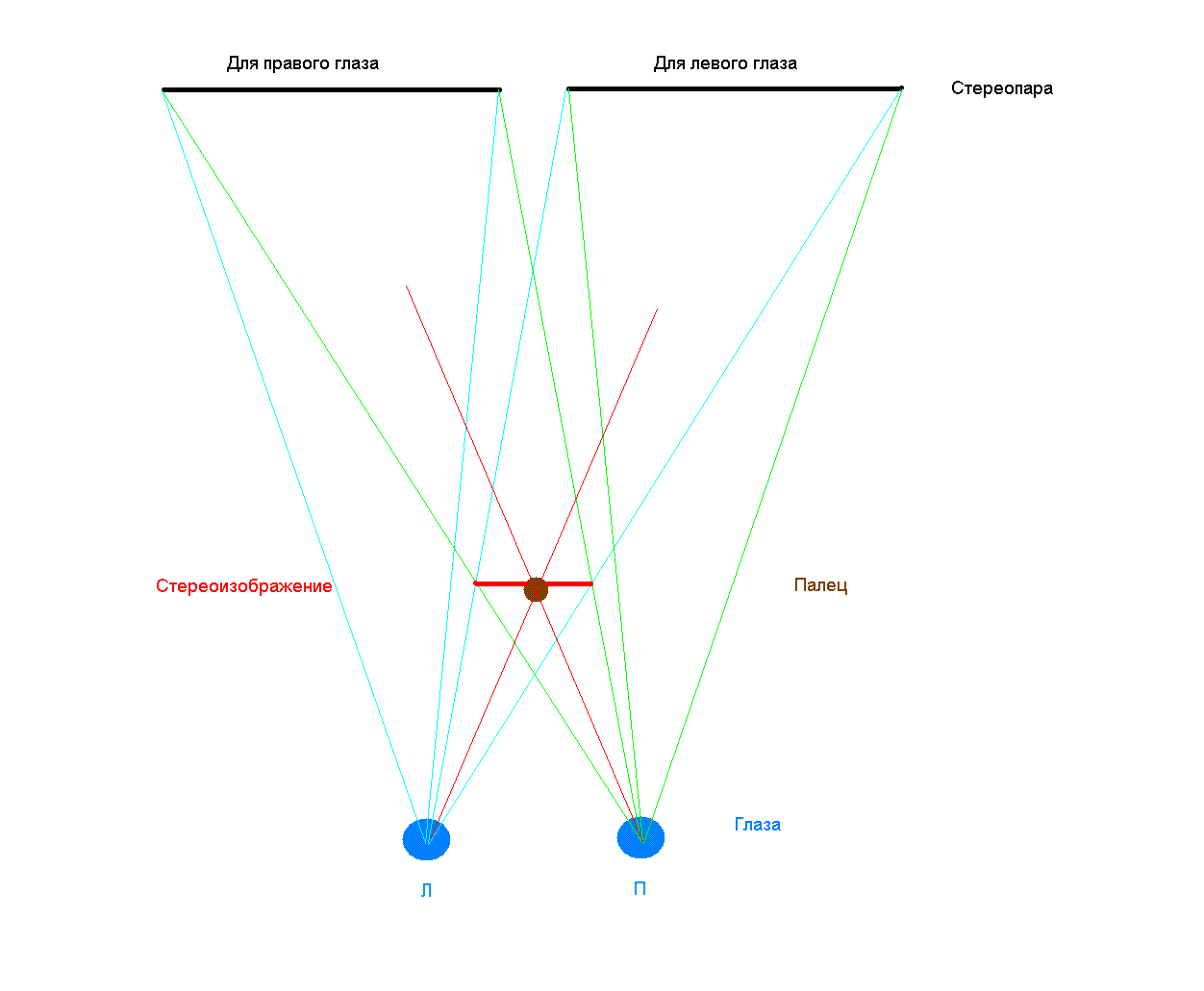 Суть стереоизображения - наличие двух картинок, каждая представляет то, что должен видеть один из двух глаз. Эти картинки необходимо "свести вместе". Для сведения можно использовать геометрическую оптику (стереоскопы), поляризацию (поля-очки с поля-освещением), временнОе деление (развертка на мониторе плюс мигающие очки), а также другие продвинутые методы. Но есть нечто совсем простое, что я и покажу сейчас.