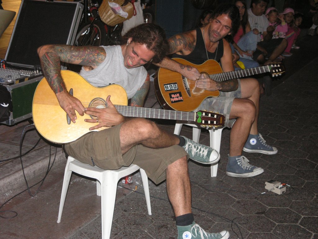 Нет, там ТОЛЬКО две гитары, за это ручаюсь головой )). Электроника только снимающая и усиливающая. Я смотрю и слушаю, когда стою, при этом стараюсь проследить работу пальцев и каждый отдельный звук. Иногда они проводят пальцем по струне - звук отдаленно напоминающий смычковый )). Эти двое виртуозы высокого класса. То, что они выбрали себе эту сцену и не уходят никуда - это, действительно слабо понятно. Может, они и работают еще где-то, не знаю. Кстати, приходят они задолго до своего времени (лицензия только на определенное время и место, с точностью до метров) и беззвучно бегают пальцами по струнам.