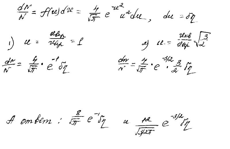 А разве я не ответил?.. Берешь функцию распределения по скоростям. Смотришь на ее максимум - он достигается при наиболее вероятном значении (допустим, Vo). Потом берешь интеграл этой функции от Vo*0.95 до Vo*1.05 - вот и все.. Причем, интегрировать на самом деле не обязательно, нужно просто домножить значение функции на 0.01*Vo - да и все (то есть заменить интеграл прямоугольничком). Для среднеквадратичной скорости поступить аналогично. ответ у меня не сходится...в чём ошибка? Эскизы прикрепленных изображений |