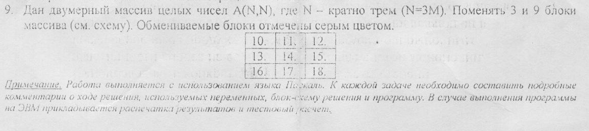 2. сделать массив не из элементов, а из блоков... то есть создать свой тип - массив М*М, а исходный тогда будет array[1..3,1..3] of этот тип Если допустить, что в задаче необходимо поменять 3 и 9 блоки(цифры 12 и 18) на 2 и 7 блоки(цифры 11 и 16) соответственно, то ведь для разных N(кратных 3) эти элементы будут иметь разные индексы. Как тут быть? |