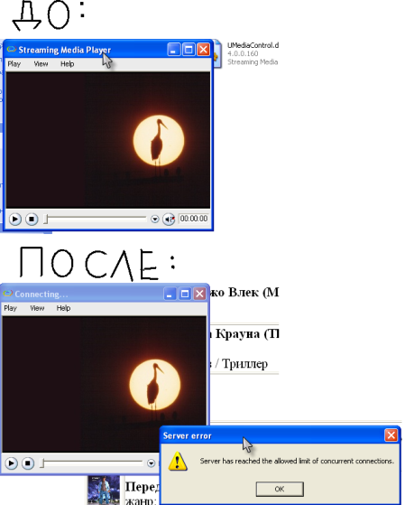 Как я уже писал, пишу прогу для поиска свободного места на сервере с видеофильмами. У нас установлен лимит. Если я не попадаю в лимит, то плеер выдает сообщение об ошибке. Можно, конечно, поставить на час-второй выполнение проги, коннектясь с очень малым интервалом времени (если будет свободное место, то никто не успеет его занять, ведь интервал работы программы мал), но лучше, конечно, коннектится до тех пор, пока не перестанет выдавать ошибку плеер. Поставил интеравал несколько милисекунд, через 3 минуты даже мышкой не можно было двигать