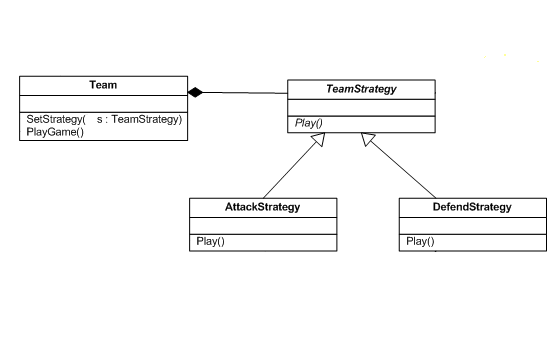 Можно сделать, чтобы во время матча(до матча) можно было менять стратегию на игру. Например, атакующая и защищающаяся.Если по ходу матча команда забивает гол=> защищаемся и у команды соперника меньше шансов забить гол. У меня даже уже есть мысли по реализации этих методов. Имеем: объект TeamStrategy(метод play), у него 2 наследника: Attacktrategy(метод play) и DefendStrategy(метод play) см.рис. Отсюда полиморфизм: для разных стратегий - разный play. Выскажите пожалуйста своё мнение.Помогите хоть немного с реализацией(хоть для начала описание) Play будет виртуальным?? Эскизы прикрепленных изображений |