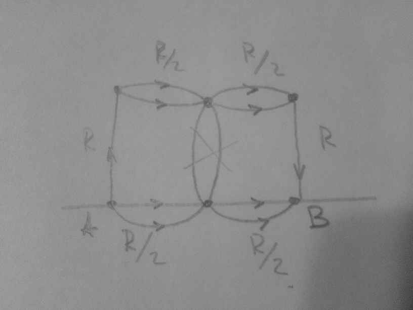 Синий ток, как я уже сказал, раделяется на два. Попробуем представить синий провод сразу двойным. По одному течет одна половина тока, которая пойдет направо, а по другому - другая, которая пойдет налево. Это можно осуществить и в реальности. Для этого нужно заменить сопротивление, соответствующее одному ребру, двумя параллельными сопротивлениями. Конечно, в соответствии с правилами расчета сопротивлений, каждое из этих сопротивлений должно быть в два раза больше: