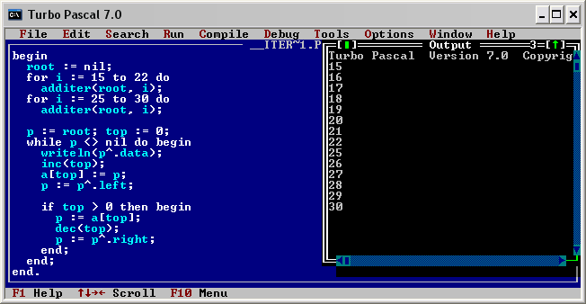 1)Начальная установка: TOP:=0; P:=T. 2)Если P=nil, то перейти на 4. {конец ветви} 3)Вывести P^.info. Вершину заносим в стек: TOP:=TOP+1; A[TOP]:=P; шаг по левой ветви: P:=P^.llink; перейти на 2. 4)Если TOP=0, то КОНЕЦ. 5)Достаем вершину из стека: P:=A[TOP]; TOP:=TOP-1; 6)Шаг по правой связи: P:=P^.rlink; перейти на 2. Пожалуйста!! Очень надо!!! |