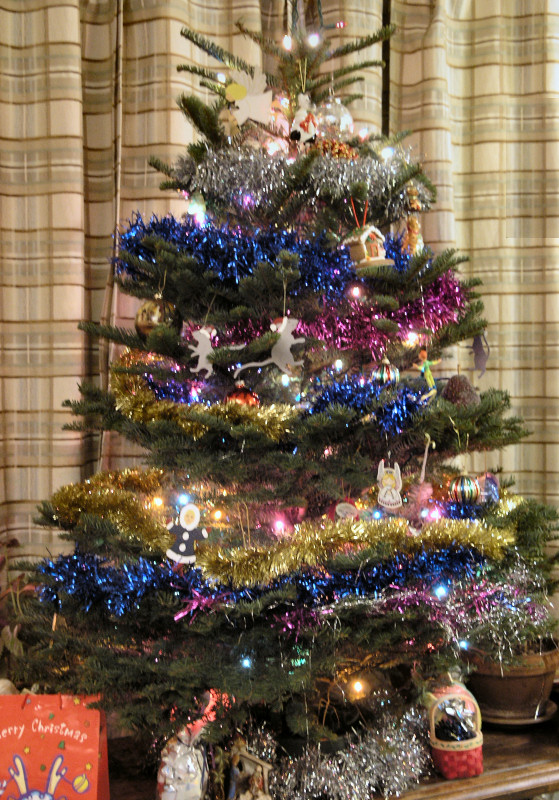 Все же успели купить и нарядить елку до Рождества. Не очень большая - но елка! Большинство тут все же либо сосны, либо совсем не пойми что. Эта - чудесная елочка из Орегона, росла под дубом (нашел в ветвях три сухих дубовых листа). Очень симпатичная. Нарядили, как сумели..