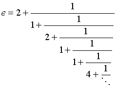 По теме: для e1 было разложение Эйлера в цепную дробь: (последовательность неполных частных: 2, 1, 2, 1, 1, 4, 1, 1, 6, 1, 1, 8, 1, 1, 10, 1, 1, 12, 1, 1, 14, 1, 1, 16, 1, ...) Есть программа на C, вычисляющая приближенные значения трансцедентных функций - среди них Sin, Cos, Tan, Exp, Sinh, Cosh и Tanh - разложением в цепные дроби) - в этом разделе offtop, если надо - обращайся... |