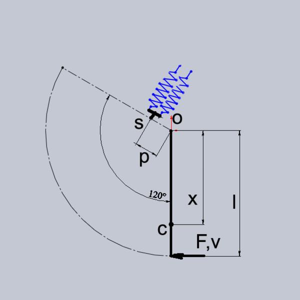 Имеется труба ( Ф100мм ) через которую осуществляется сброс давления газа. Труба закрыта крышкой на петле (точка О, рисунок), которая сдерживает давление в 75 атм. когда давление достигает этого значения, крышка (масса которой 0,7 кг) откидывается, и, достигая угла 120 градусов, ударяет по пружинному буферу (пакету буферов n) площадкой (точка s), расположенной от оси вращения крышки на расстоянии 30 мм (расстояние р) (расстояние от центра масс крышки до оси вращения Х = 45 мм).