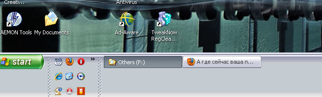 Панель задач - внизу, как всегда. Поскольку часто приходится работать на разных машинах под разными ОСями (где-то WinXP, где-то Win7, на некоторых машинах Win2003), то на всех этих машинах должно быть одинаковое расположение TaskBar-а. А на WinXP панель задач сбоку выглядит ужасно (у меня установлена тема Silver, даже если чуть расширить горизонтальную панель - вид становится кошмарным: