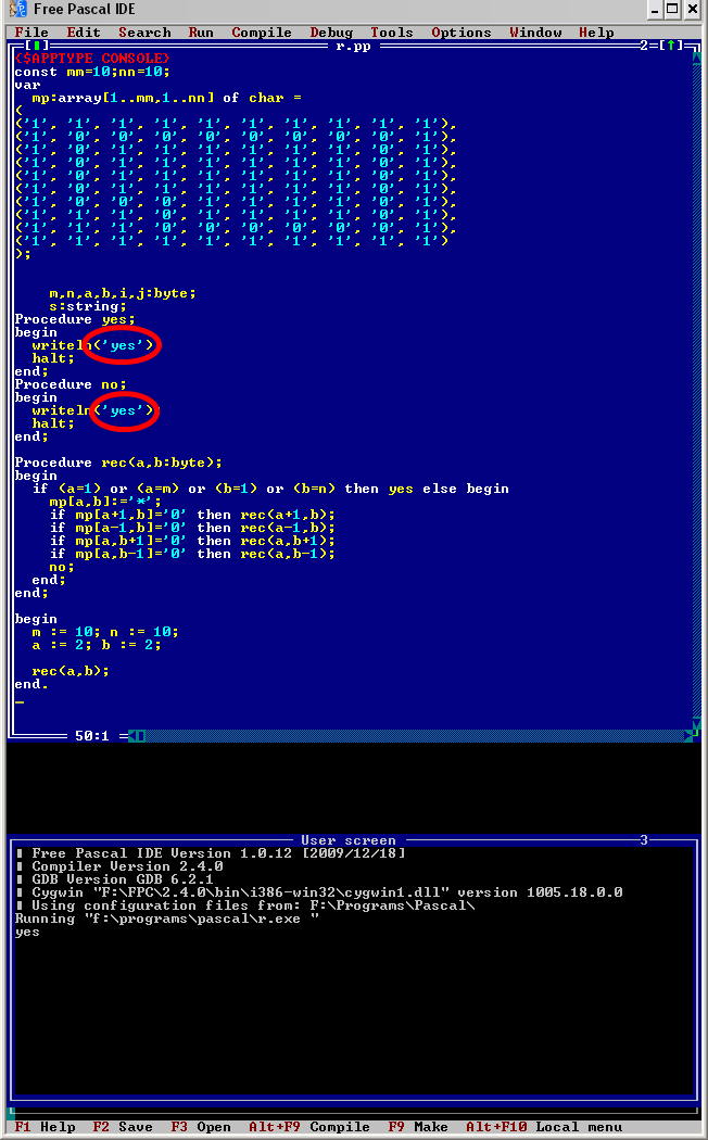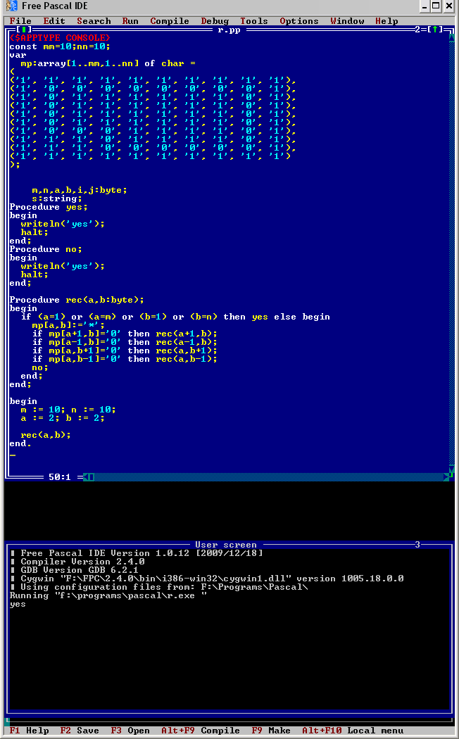 Выяснить, сможет ли человек выйти из лабиринта, если его поместить в комнату с координатами (A, B)? Порядок ввода исходных данных: M N p11 p12 ... p1N p21 p22 ... p2N . . . pM1 pM2 ... pMN A B Здесь M - количество строк на рисунке плана, N - количество столбцов на рисунке плана, p(i, j) - цифра ноль или один, соответствующая клетке плана с координатами i, j. A, B - координаты человека в лабиринте. Порядок вывода результатов: Да | Нет Пример ввода: 10 10 1 1 1 1 1 1 1 1 0 1 1 0 0 0 0 0 0 0 0 1 1 0 1 1 1 1 1 1 0 1 1 0 1 1 1 1 1 1 0 1 1 0 1 1 1 1 1 1 0 1 1 0 1 1 1 1 1 1 0 1 1 0 0 0 1 1 1 1 0 1 1 1 1 0 1 1 1 1 0 1 1 1 1 0 0 0 0 0 0 1 1 1 1 1 1 1 1 1 1 1 2 2 Пример вывода: Да Эту задачу надо решать рекурсией?? Сообщение отредактировано: xxx000 - |