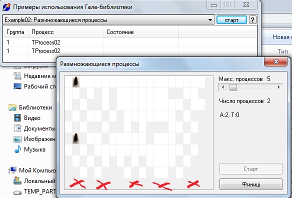 Ну, чего и следовало ожидать. Ты что в TProcess02.Execute творишь? Было же нормальное поведение, зачем понадобилось на каждом шаге бегать в случайном направлении? Чтобы усложнить доступ к каким-то клеткам? Это первое. Второе: