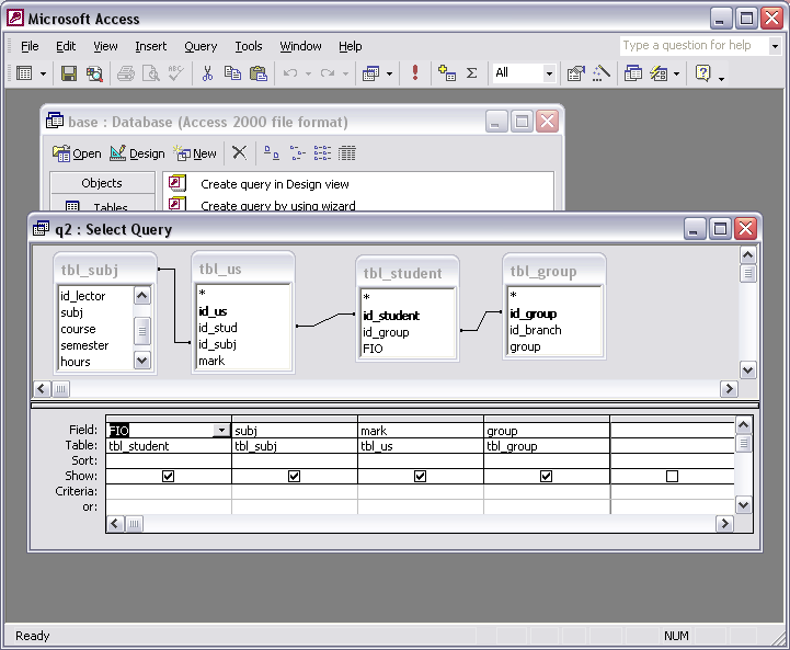 В ходе написания проги возник вопрос: мне нужно вывести успеваемость студентов определенной группы в дбгрид. Я почитал книгу по скл запросам, нашел INSERT INTO SELECT, т.е. из одной в другую переносит значения, однако есть жесткие ограничения насчет количества столбцов. потом пробывал сделать в аксесе запрос, который просто подключил бы к адотейбл и выводил бы всех студентов и запросом ограничивал бы группу. Но и здесь проблема: в гриде выводит только одно поле'ФИО' и все, очтальную информацию не показывает, а в аксесе все норм.