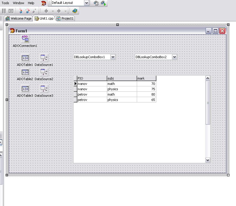 1) на форме DataSource (2 шт.), ADOTable (2 шт.) и DBLookupComboBox (тоже 2 шт.)