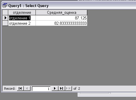 SQL SELECT Отделения.отделение, Avg(Успеваемость.оценка) AS Средняя_Оценка FROM ((Отделения INNER JOIN Группы ON Отделения.id_отделения = Группы.Id_отделения) INNER JOIN Студенты ON Группы.Id_группы = Студенты.Id_группы) INNER JOIN Успеваемость ON Студенты.Id_студента = Успеваемость.Id_студента GROUP BY Отделения.отделение; прекрасно выводит отделения и средние баллы по ним: (при условии, что в базе есть студенты, принадлежащие разным отделениям. Я сначала тоже заполнил базу несколькими значениями, запустил SQL-запрос, а он мне только одно отделение со средним баллом показывает. Потом сообразил, что все группы, куда я запихал студентов - как раз с одного отделения и есть, разумеется, мне и выдается в ответе одно среднее значение. Добавил пару студентов из других групп - заработало...) |