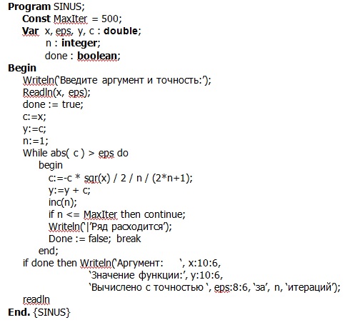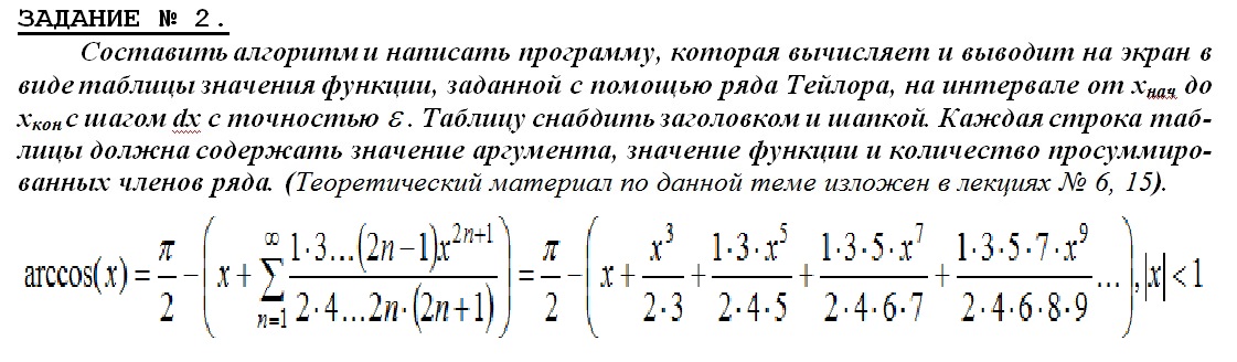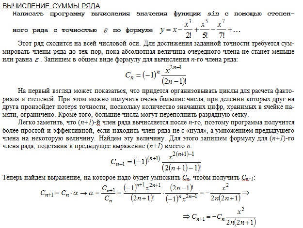 В примере показывается как вычислить функцию, предсталенную сходящейся суммы знакопеременного ряда, а в пояснении - откуда и что берётся. Давай теперь для начала ты выполнишь подобное для твоего ряда. Т.е. ты полностью набираешь программу из примера, но в выражение для вычисления c подставляешь свою формулу. |