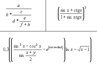sqr((sin(x)+cos(x)/sin(x))/(1+sin(x)*sin(x)/cos(x))); 3) 0.3*(((sqr(sin(x))-sqr(cos(x)))/sin((x+y)/2)-exp(abs(cos(x)+sin(x))))*ln(x)-sqrt(x-1)); вот что получилось без проверки Сообщение отредактировано: klem4 - -------------------- perl -e 'print for (map{chr(hex)}("4861707079204E6577205965617221"=~/(.{2})/g)), "\n";'