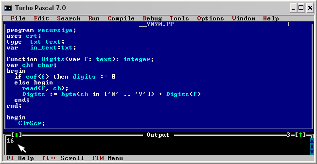 Какие переменные? У меня простите ХВОСТОВАЯ (!!!) рекурсия (заметь, по правилам, в отличие от твоей, оформленная, с условием выхода из рекурсии), и как только достигнут конец файла, Digits обнуляется (ОДИН раз, как и положено!!!).