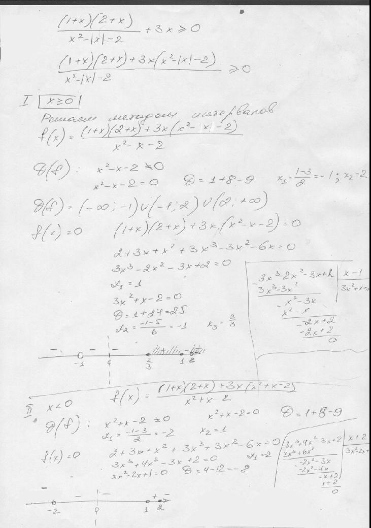 Есть неравенство (1+x)(2+x)/(x*x-|x|-2)>= -3x. К нему ответ [2/3;1) U (2;бесконечность)...