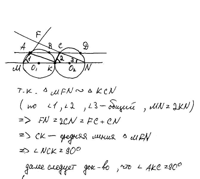 Две равные окружности касаются в точке К. Секущая , параллельная линии центров , пересекает эти окружности последовательно в точках A B C D . Доказать что угол AKC - прямой.