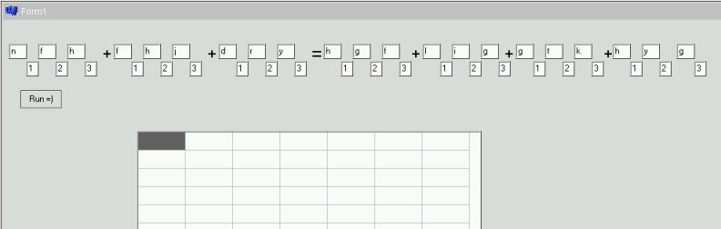 На форме Edit'ы для введения элементов веществ и их индексов с расчетом на 3 вещества в левой части и 4- в правой.А так же-StringGrid для выведения полученной матрицы.