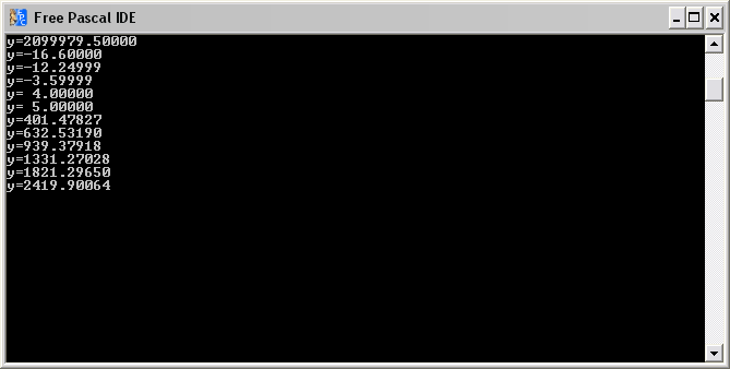 Program org; const a=2.1; b=1.8; c=-20.5; var x,y:real; dx:integer; begin x:=0; dx:=1; while x-12<0.000001 do begin if x<4 then begin y:=(a/x)+(b*x*x)+c; end; if x>6 then begin y:=(a*x)+(b*x*x*x)+sqr(sin(x)); end; else y:=x; end; writeln('y=',y:8:5); x:=x+dx; end; readln; end.
