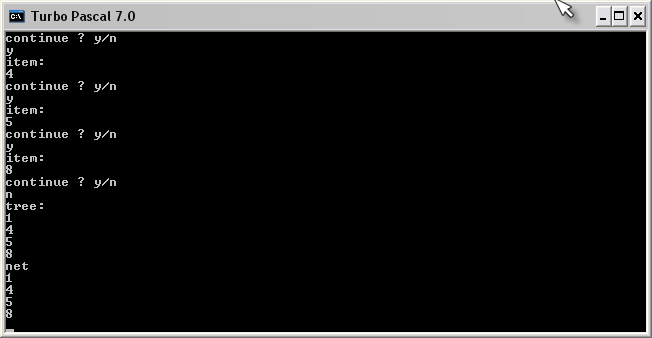 uses crt; type pspisok=^derevo; derevo=record i:string; nextL:pspisok; nextR:pspisok; end; var r,r1:pspisok; a:string; c:char; procedure dobavl(var r,r1:pspisok); begin if r=nil then r:=r1 else if r1^.i>r^.i then dobavl(r^.nextR,r1) else dobavl(r^.nextL,r1) end; procedure vyvod(var r:pspisok); begin if r<>nil then begin vyvod(r^.nextL); writeln(r^.i); vyvod(r^.nextR) end end; procedure poisk(var r:pspisok;a:string); var y:boolean; begin if r=nil then writeln('net'); if r^.i=a then writeln('est') else if a>r^.i then poisk(r^.nextR,a) else poisk(r^.nextL,a); end; begin clrscr; r:=nil; c:='y'; while c='y' do begin writeln('Введите элемент'); readln(a); new(r1); r1^.i:=a; r1^.nextL:=nil; r1^.nextR:=nil; dobavl(r,r1); writeln('Продолжить ввод? y/n'); readln( c ); end; writeln('Дерево:'); vyvod( r ); readkey; end.