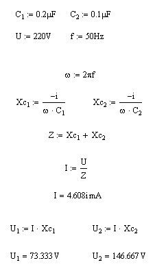 Нажмите для просмотра прикрепленного файлаZ (импеданс - полное сопротивление) в общем-то комплексная величина. Поскольку в цепи только емкостная нагрузка, можешь смело избавится от -i в Xc. С другой стороны, показательно, что ток получился мнимым, т. к. опережает напряжение (которое предполагалось действительным) по фазе на Pi / 2. Из этого следует ещё более замечательный факт - "выделяющаяся" мощность (P = U * I) тоже мнимая! И действительно, на реактивных (емкостной и индуктивной) нагрузках мощность не выделяется! Под "падениями потенциалов" (странный термин) здесь подразумевается напряжения на конденсаторах. Т. к. в цепи нагрузка только одного рода, легко заметить, что выполняется правило обычного делителя напряжения: U1 / U2 = Xc1 / Xc2 = C2 / C1. При расчетах я предположил, что под обозначением "мФ" все же имелись в виду мкФ.