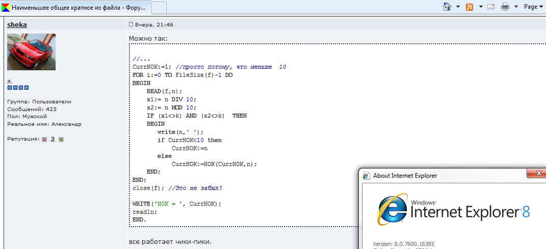 Такая проблема: после переустановки браузера на IE 8 не вижу подсветку содержимого в тэге [code=pas][/code] (подсвечивалось зеленым, синим), перестали работать кнопки "Спойлер" и "+" "-" (в повышении репутации). Может быть какие-то еще кнопки не работают, пока не заметил. Нажимаю - ничего не происходит. С чем это может быть связано? Что изменить?